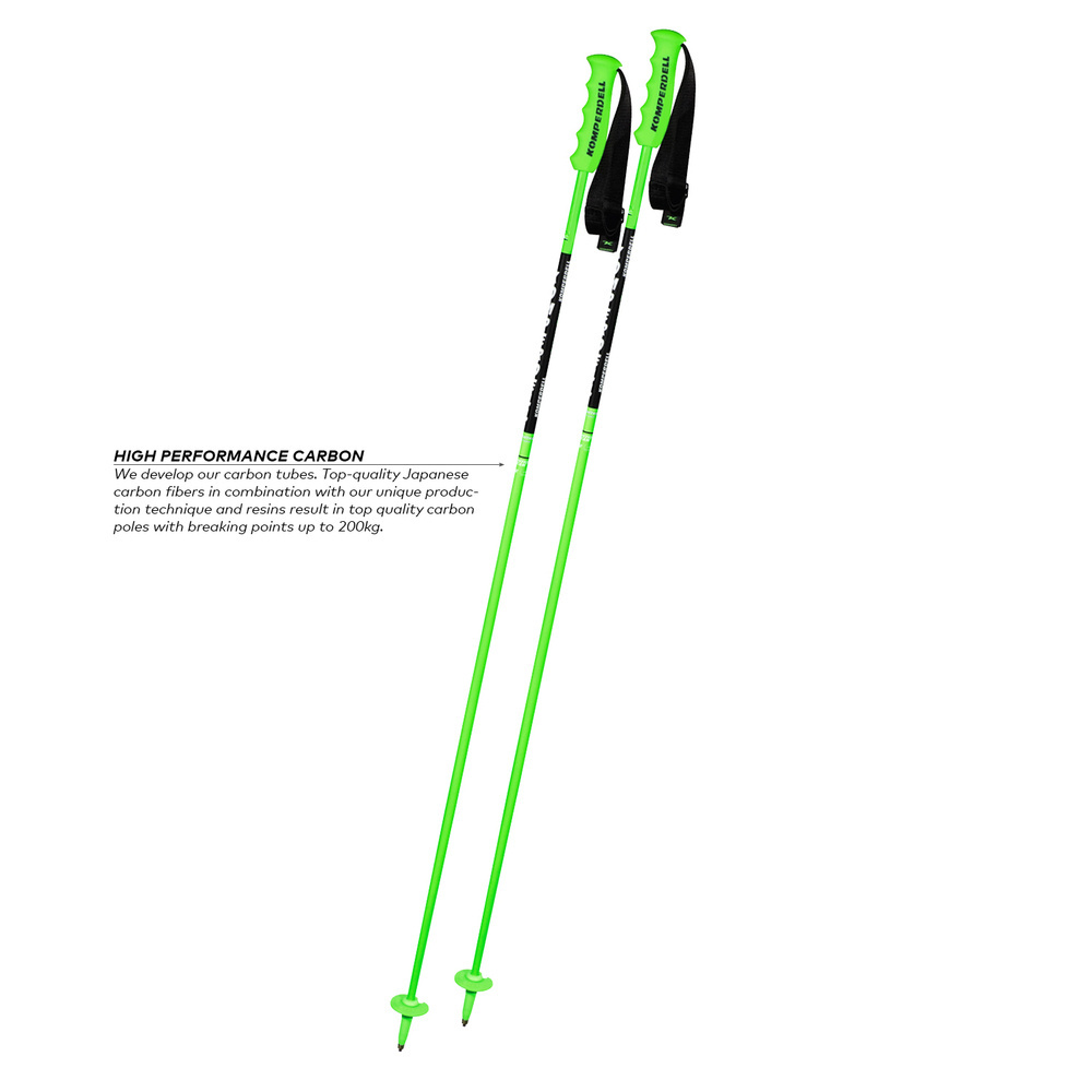 The Nationalteam Carbon Pole is suitable for every advanced skier who would like to benefit from the Komperdell Worldcup design without purchasing the original Worldcup equipment. The exceptionally lightweight tube consists of top-quality carbon fibers. With its distinctive green-black design, it catches the eye on the ski slopes. The pole, in combination with the race grip Duplo and the mini race basket, is ideal for ambitious skiers who attach great importance to quality and design. The powder strap is easy to open and close, ensuring maximum hold.