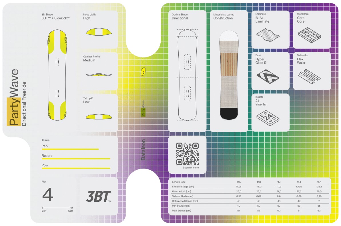 The Party Wave is everyone’s favorite fun board. Decades of experience with 3D shapes have enabled us to shift volume from length to width without sacrificing edge-to-edge performance.. It’s designed to be ridden 5-10 cm shorter than your regular deck. It’s a nimble and floaty pocket rocket that dials up the fun all over the mountain.