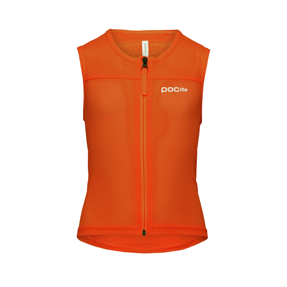 - POCito kids' vest with certified VPD Air back protection, breathable mesh, front zipper, and fluorescent colors for better visibility on the slopes.
