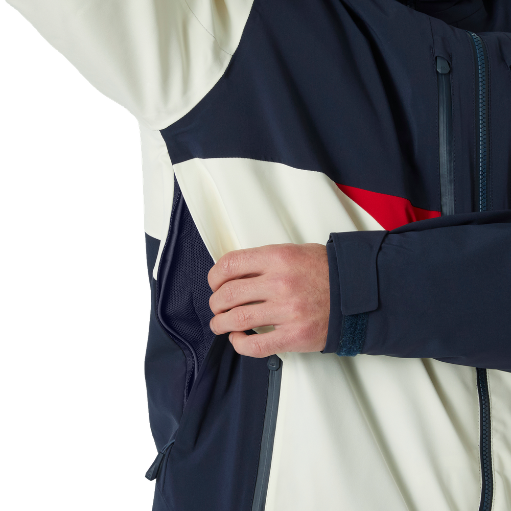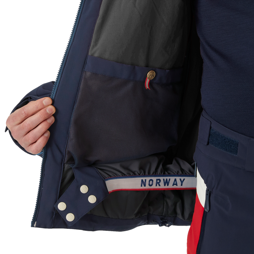 • We developed the Men's Kvitfjell Race Insulated Ski Jacket with and for the Team Telenor Alpine Norway ski teams as well as for other alpine racing enthusiasts. When the weather conditions change on the slopes, this jacket keeps you warm and dry thanks to our breathable and waterproof HELLY TECH® Professional technology. We’ve constructed the forearms specifically with ski racers in mind: the forearm offers sufficient space for arm guards and gloves so that you can pull the jacket on and off smoothly. You can experience a full range of motion with the jacket’s 4-way stretch fabric and articulated sleeves. Other convenient features include an adjustable powder skirt, an adjustable hood with a neon brim, and multiple pockets, including ones for your cell phone and ski pass. This jacket is one of several Kvitfjell Race products designed to outfit your ski racing team from head to toe.