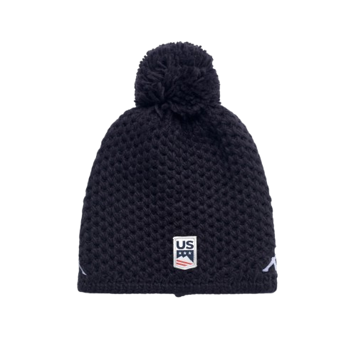 GARA. Hat unisex in wool and acrylic blended knit. Pon pon and polar lining. Embroidered Omini logos and Team personalizations. US SKI AND SNOWBOARD.